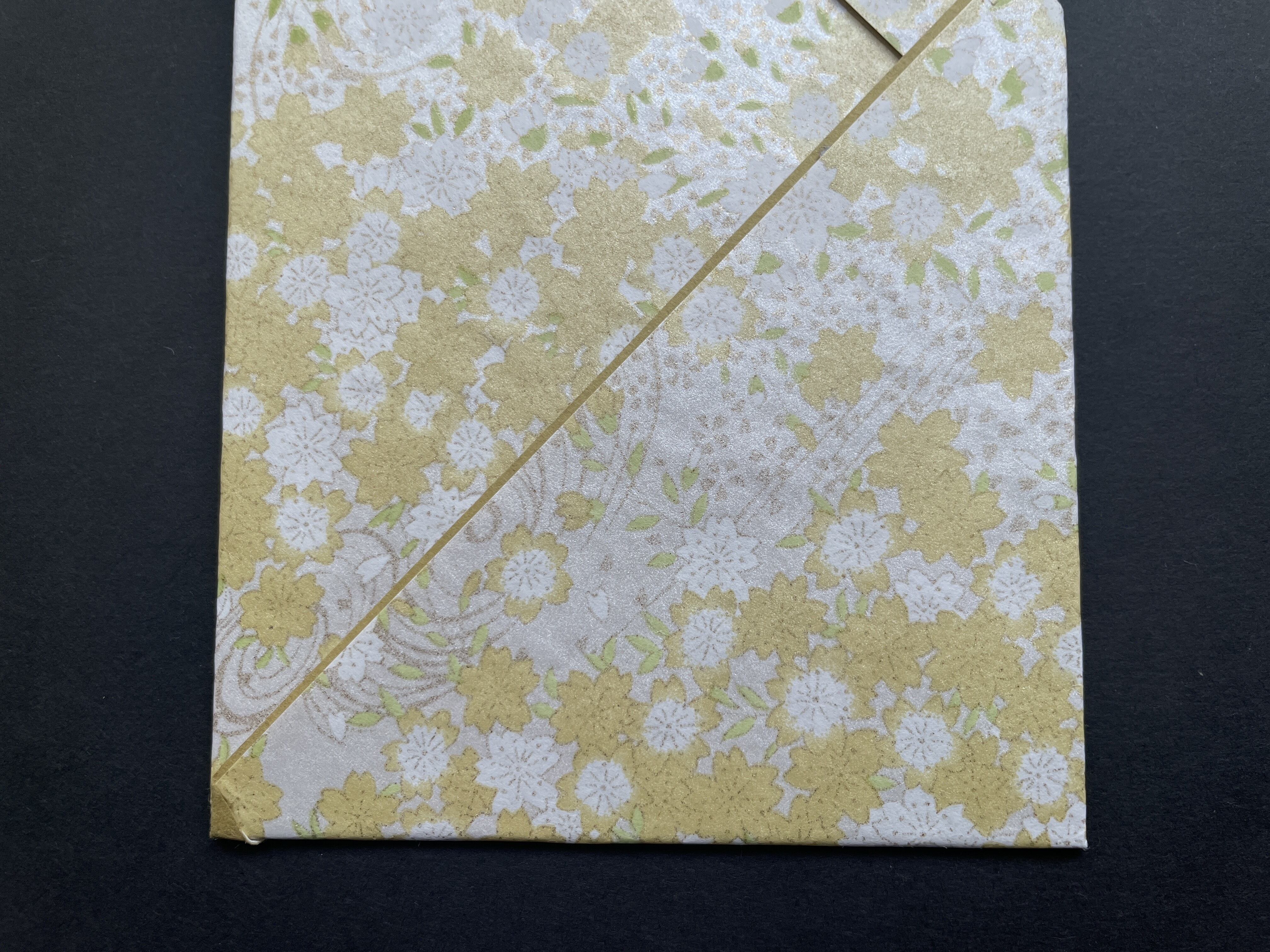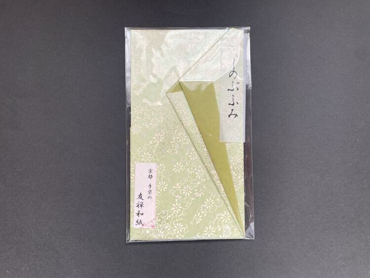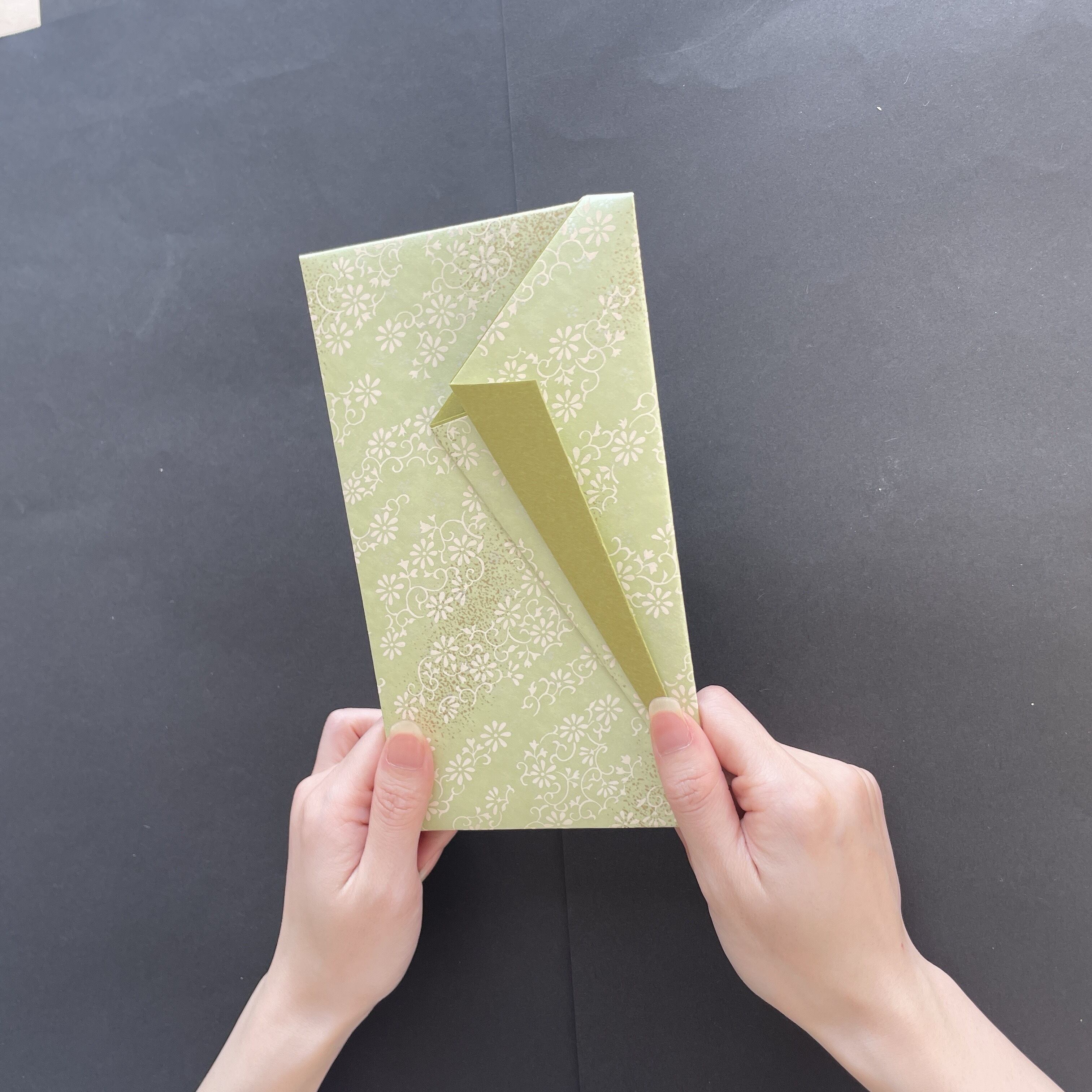 【しのぶふみ】流水 鋭三角 サイズ 20㎝×11㎝ 厚み2㎜ 流水柄には「苦難を流す」「清らか」などの意味があります。地色にパールを使った美しい手染め友禅和紙を使い、日本伝統の折形技法を用いて、ひとつずつ手づくりしています。中に直筆用の和紙(どの色か1枚)が入っております。