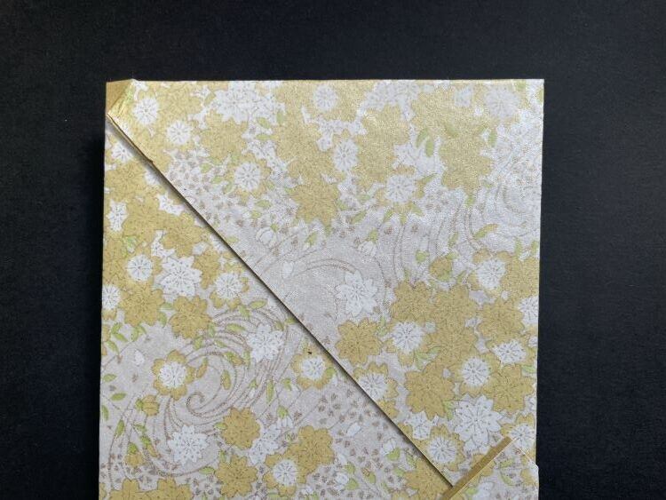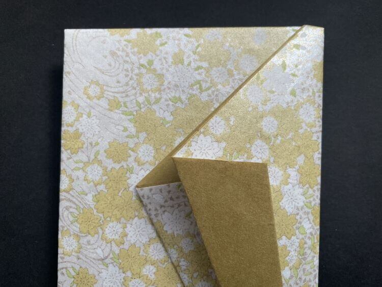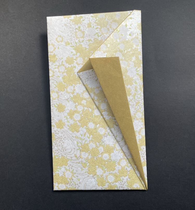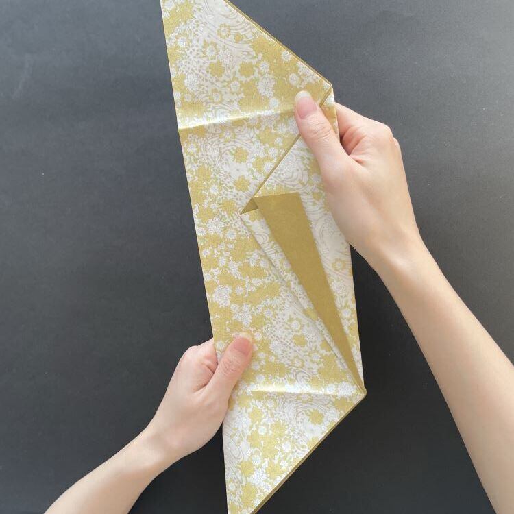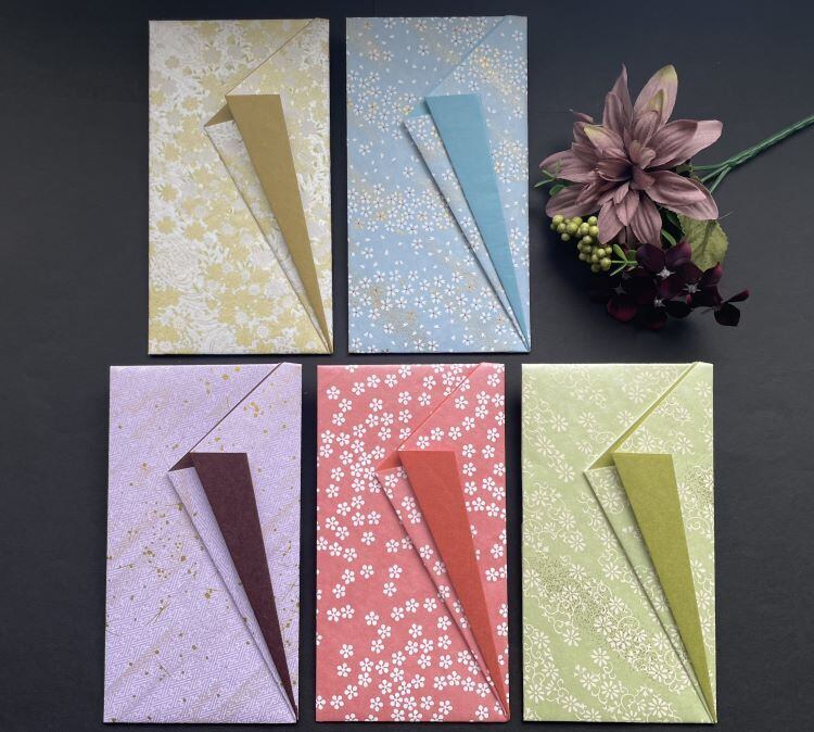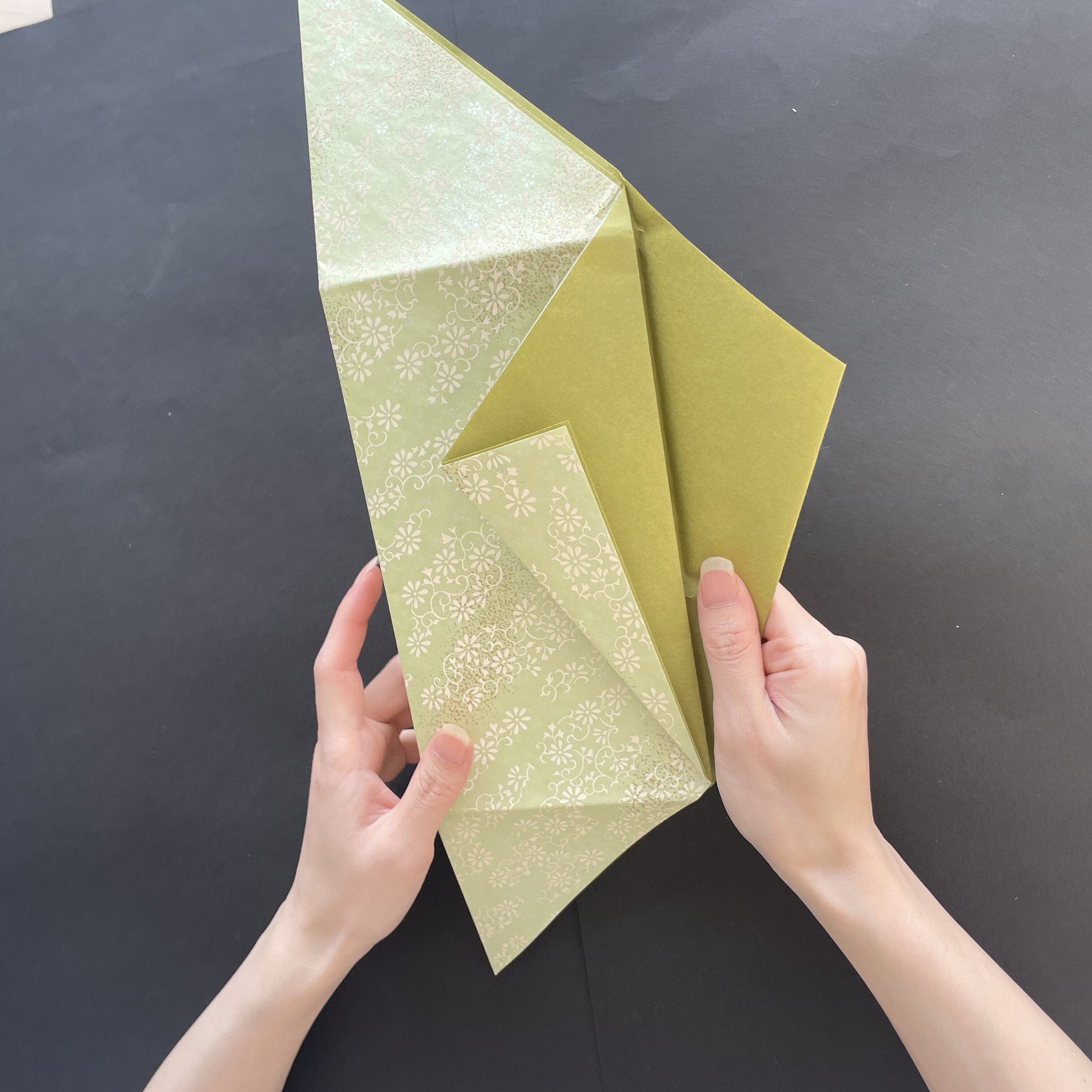 【しのぶふみ】流水 鋭三角 サイズ 20㎝×11㎝ 厚み2㎜ 流水柄には「苦難を流す」「清らか」などの意味があります。地色にパールを使った美しい手染め友禅和紙を使い、日本伝統の折形技法を用いて、ひとつずつ手づくりしています。中に直筆用の和紙(どの色か1枚)が入っております。