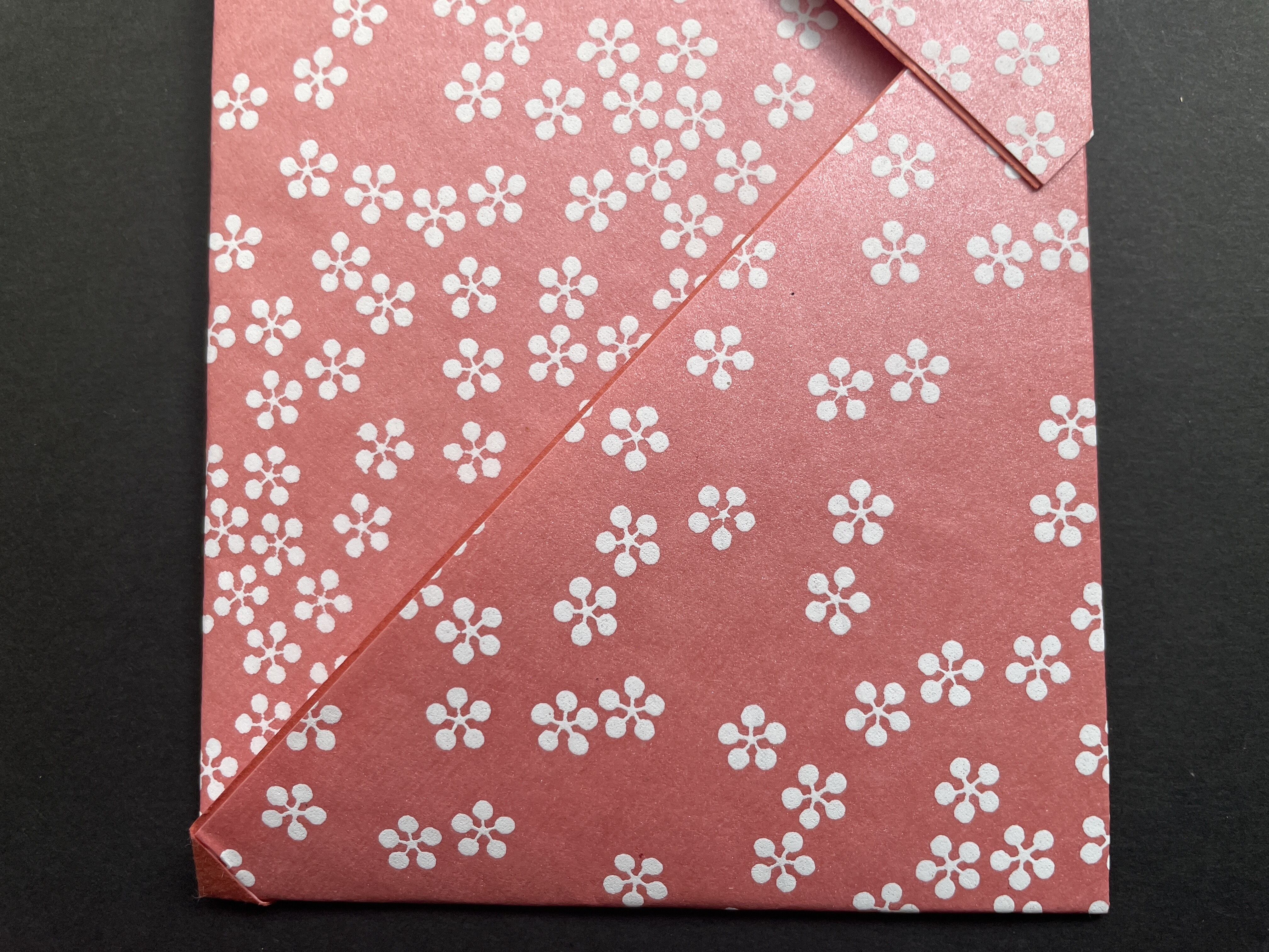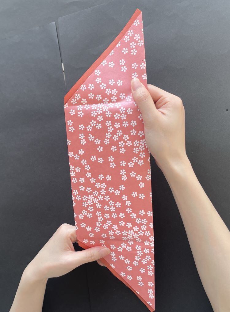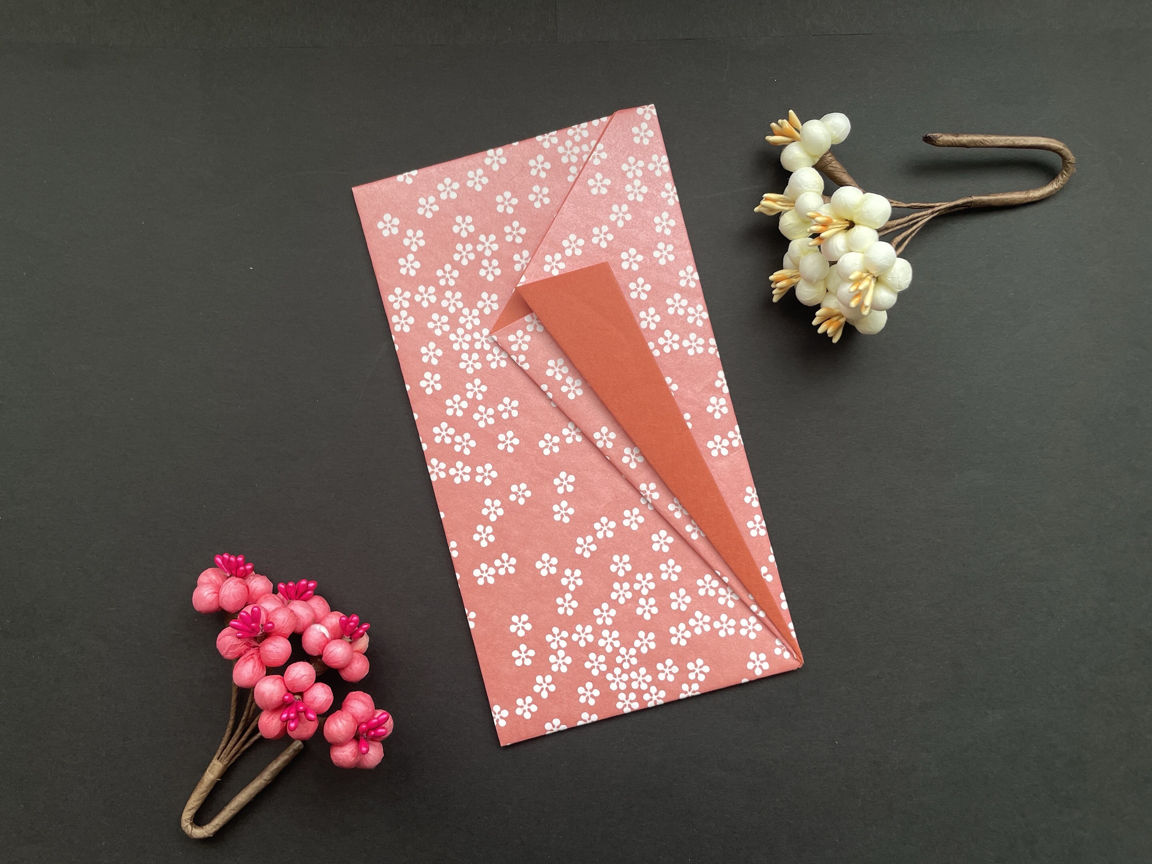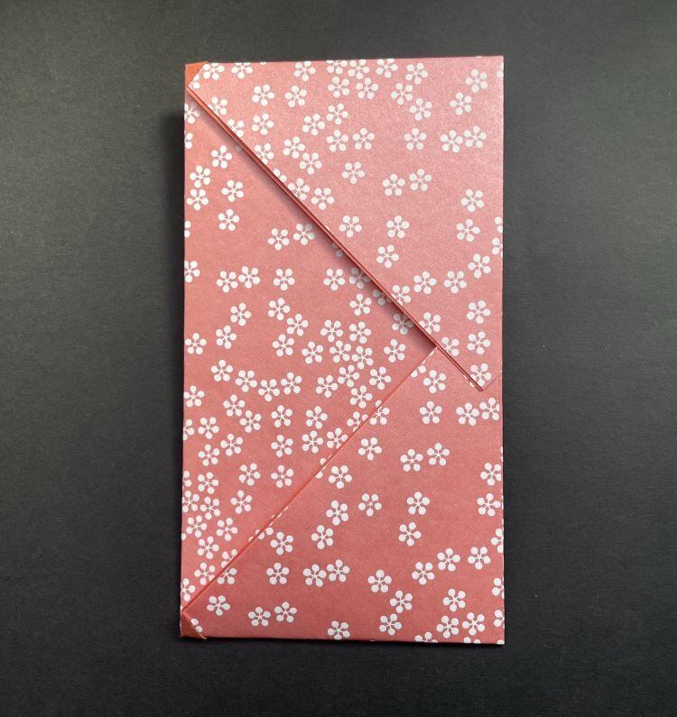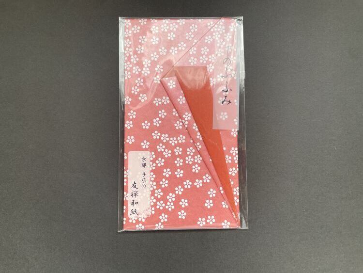 【しのぶふみ】梅鉢 鋭三角 サイズ 20㎝×11㎝ 厚み2㎜ 梅鉢柄には「春の風」の意味があり、縁起が良いとされています。地色にパールを使った美しい手染め友禅和紙を使い、日本伝統の折形技法を用いて、ひとつずつ手づくりしています。中に直筆用の和紙(どの色か1枚)が入っております。