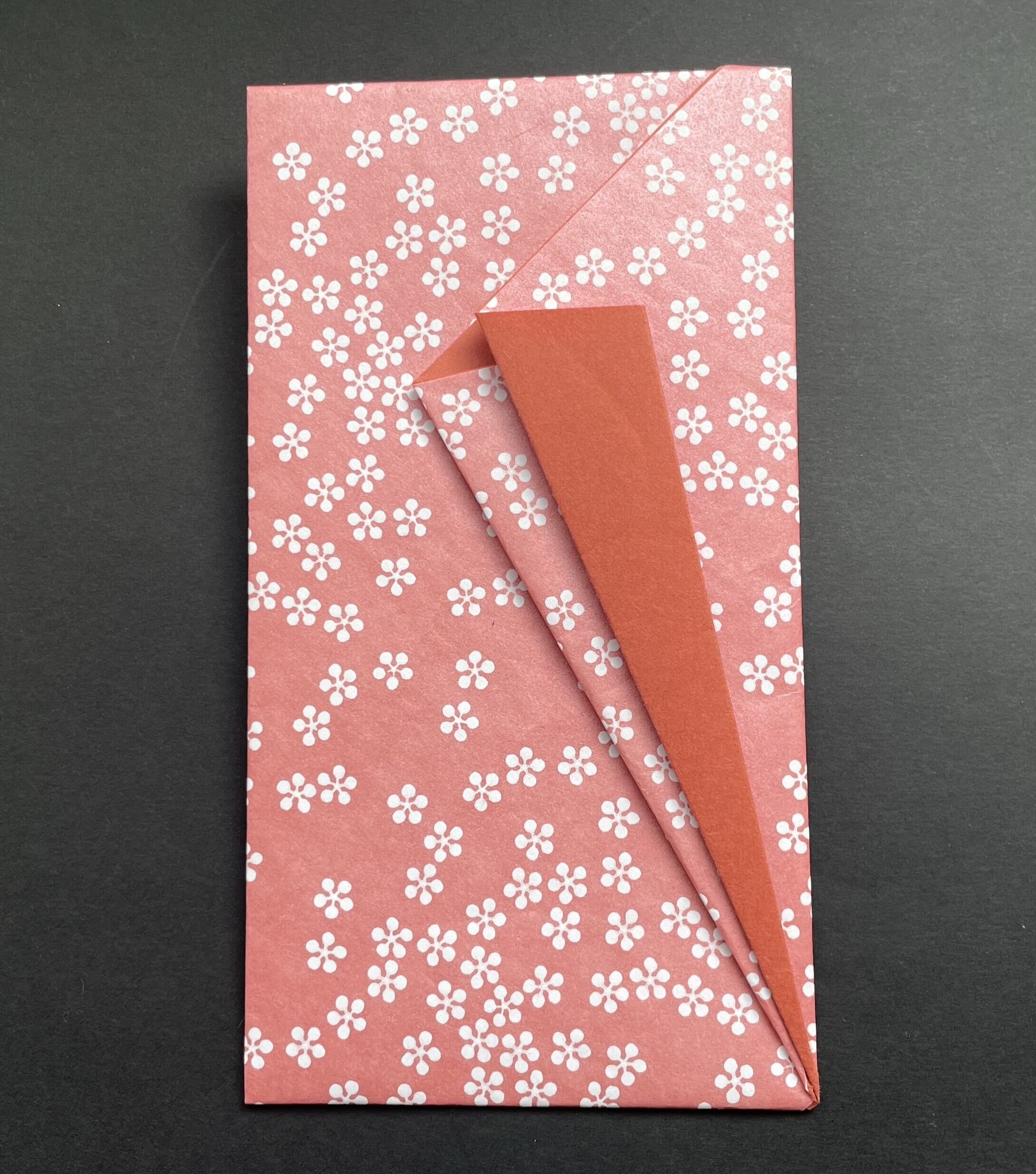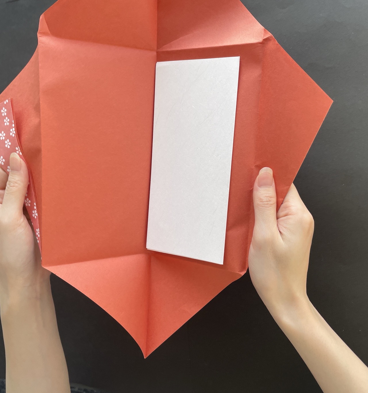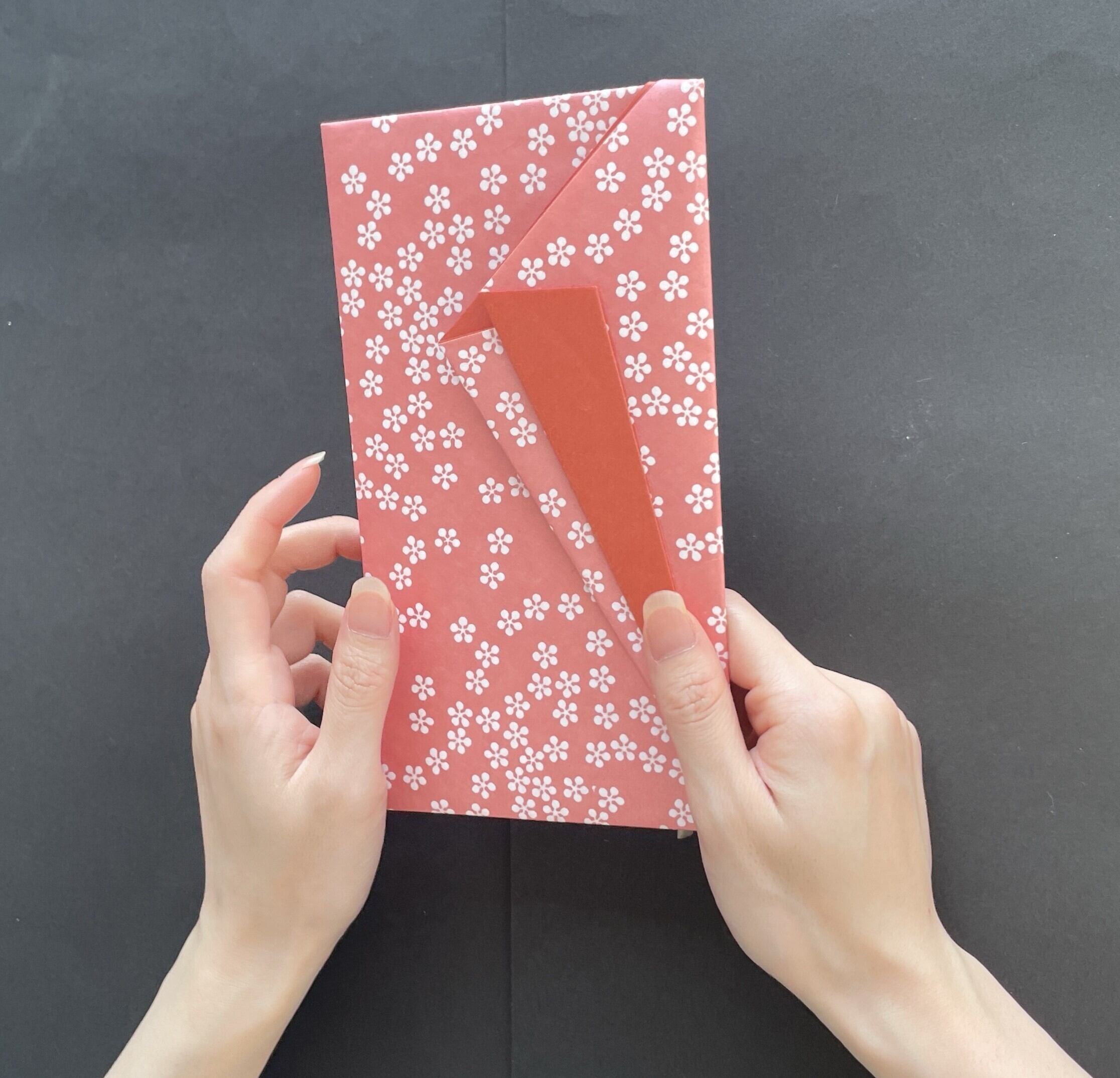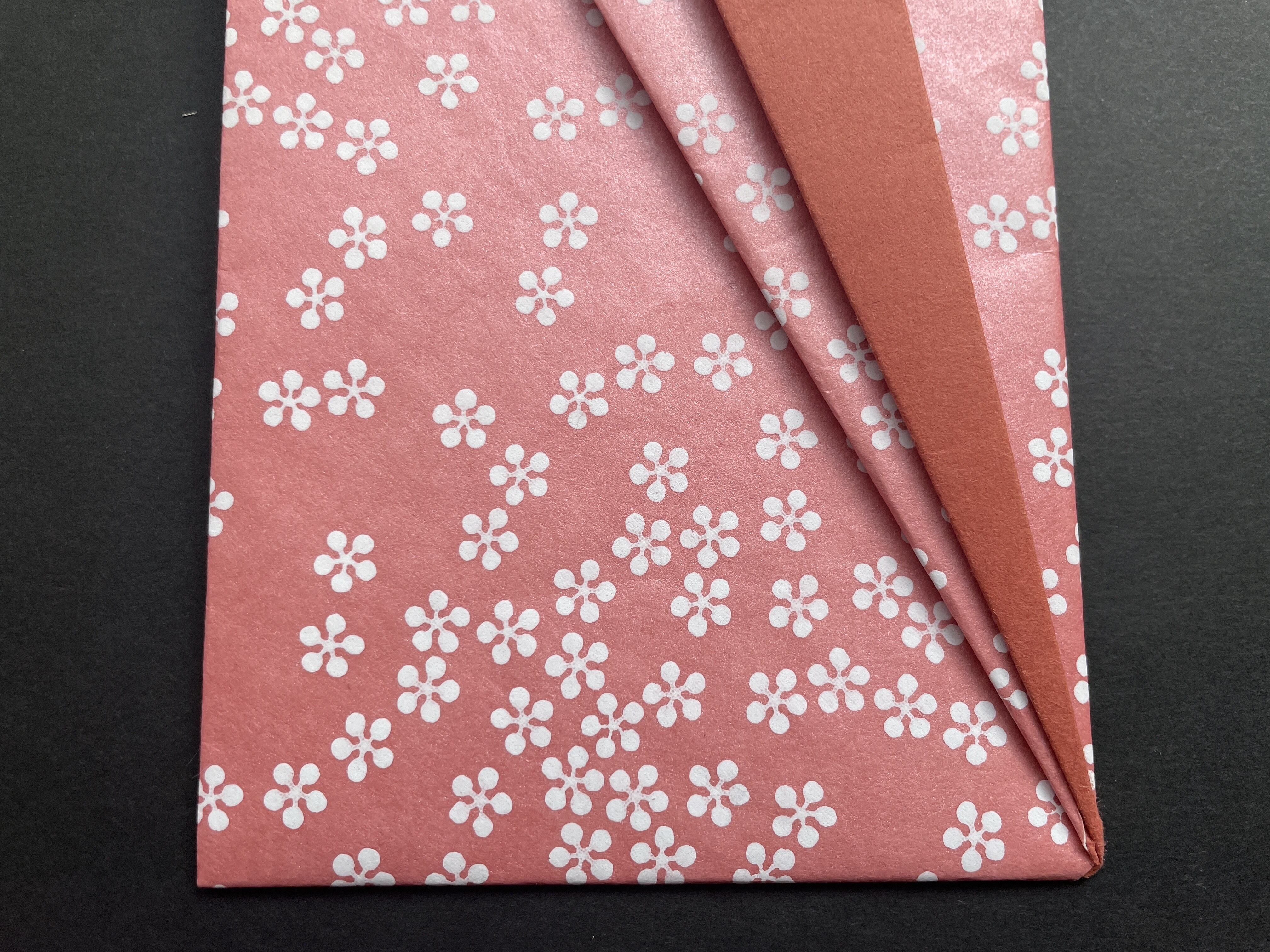 【しのぶふみ】梅鉢 鋭三角 サイズ 20㎝×11㎝ 厚み2㎜ 梅鉢柄には「春の風」の意味があり、縁起が良いとされています。地色にパールを使った美しい手染め友禅和紙を使い、日本伝統の折形技法を用いて、ひとつずつ手づくりしています。中に直筆用の和紙(どの色か1枚)が入っております。