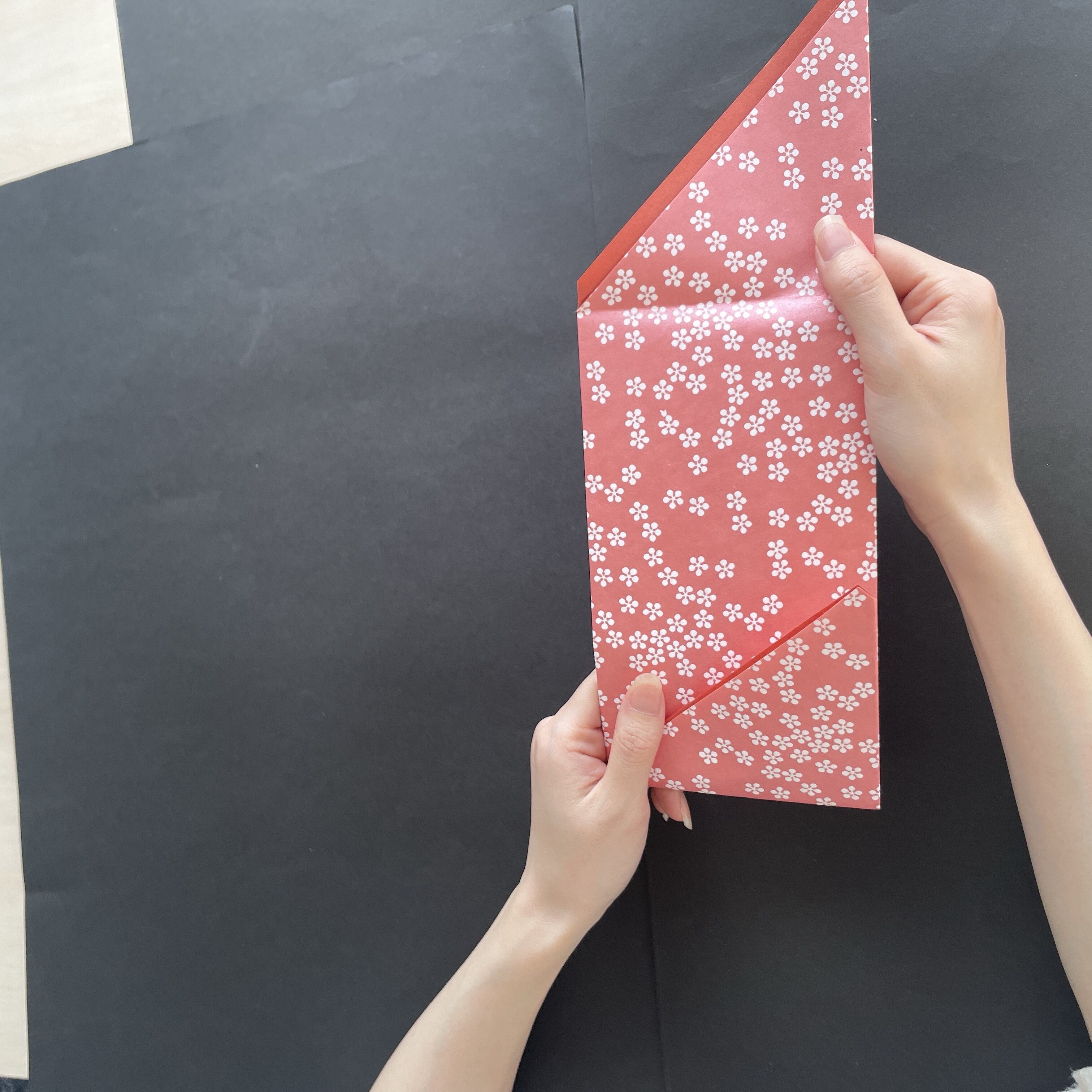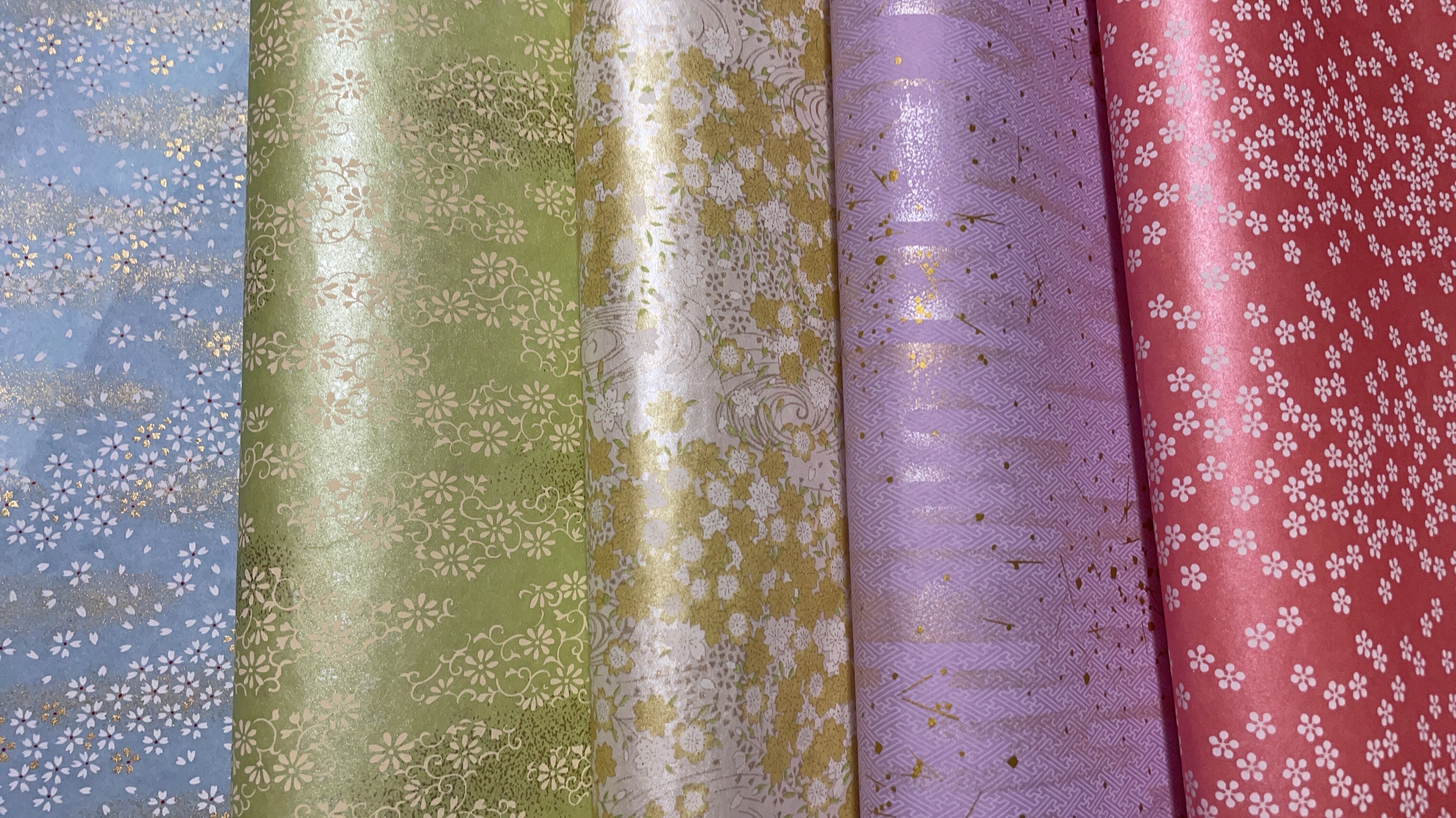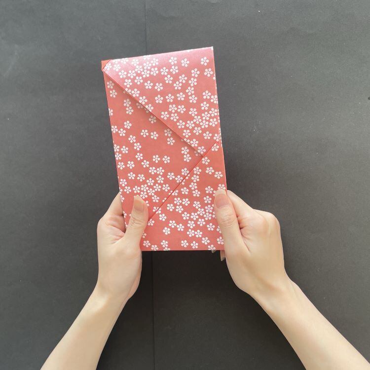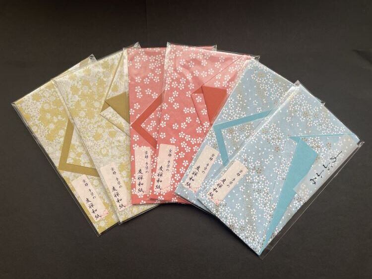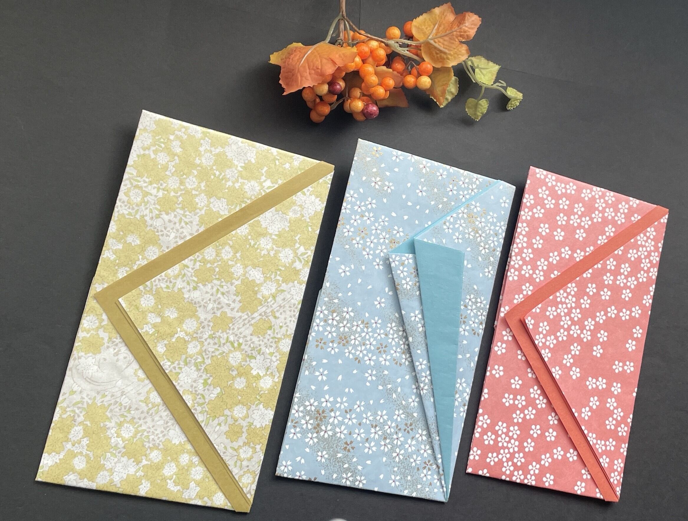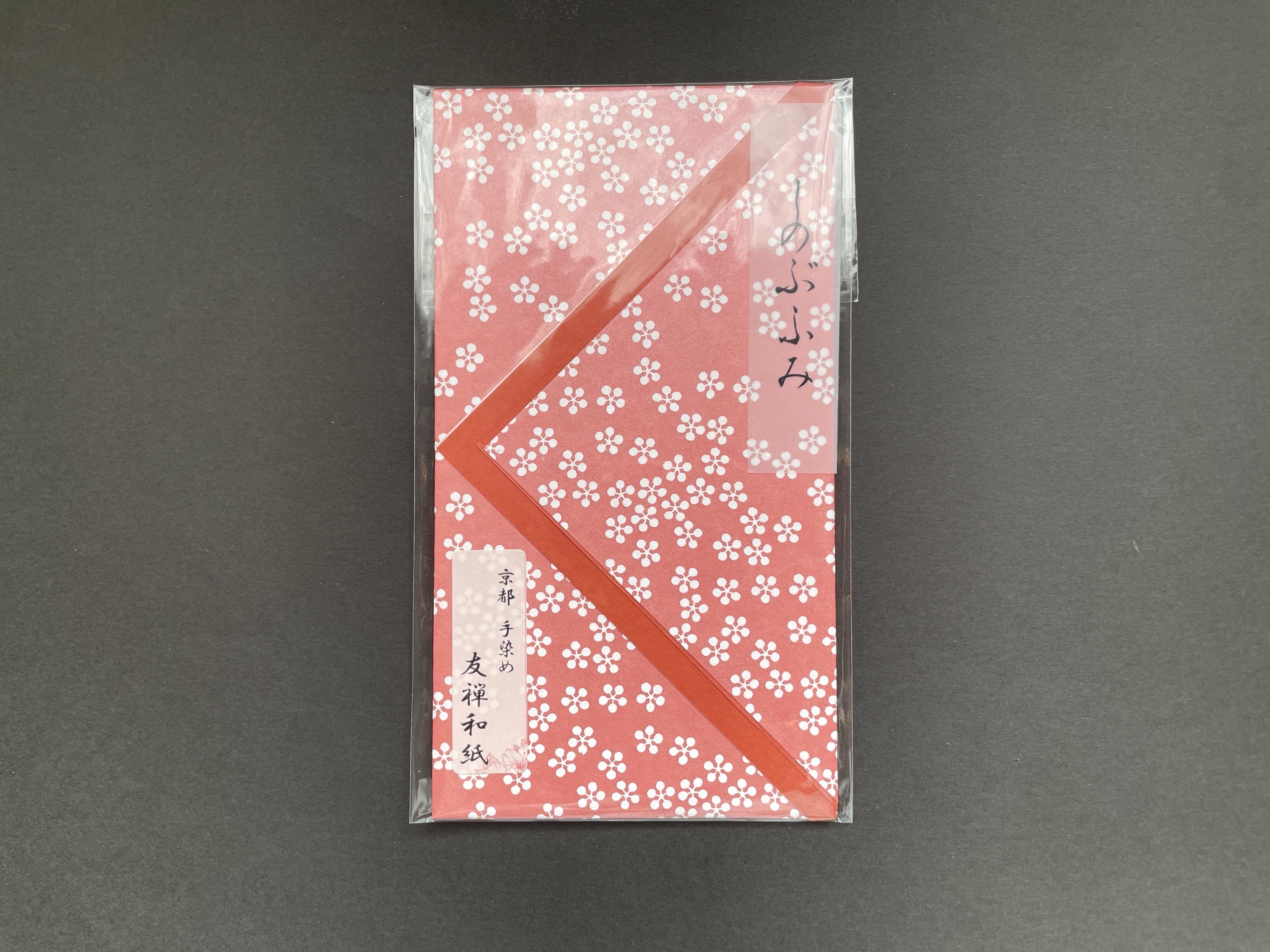 【しのぶふみ】梅鉢 小なり サイズ 20㎝×11㎝ 厚み2㎜ 梅鉢柄には「春の風」の意味があり、縁起が良いとされています。地色にパールを使った美しい手染め友禅和紙を使い、日本伝統の折形技法を用いて、ひとつずつ手づくりしています。中に直筆用の和紙(どの色か1枚)が入っております。