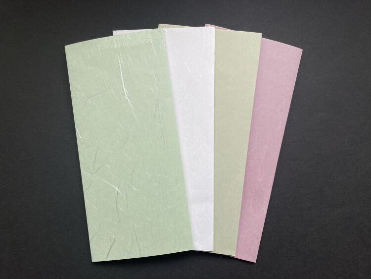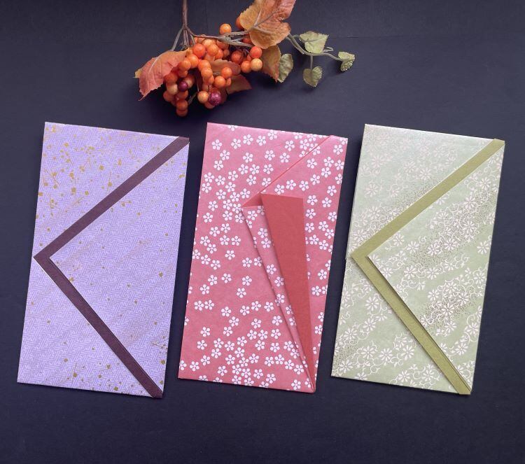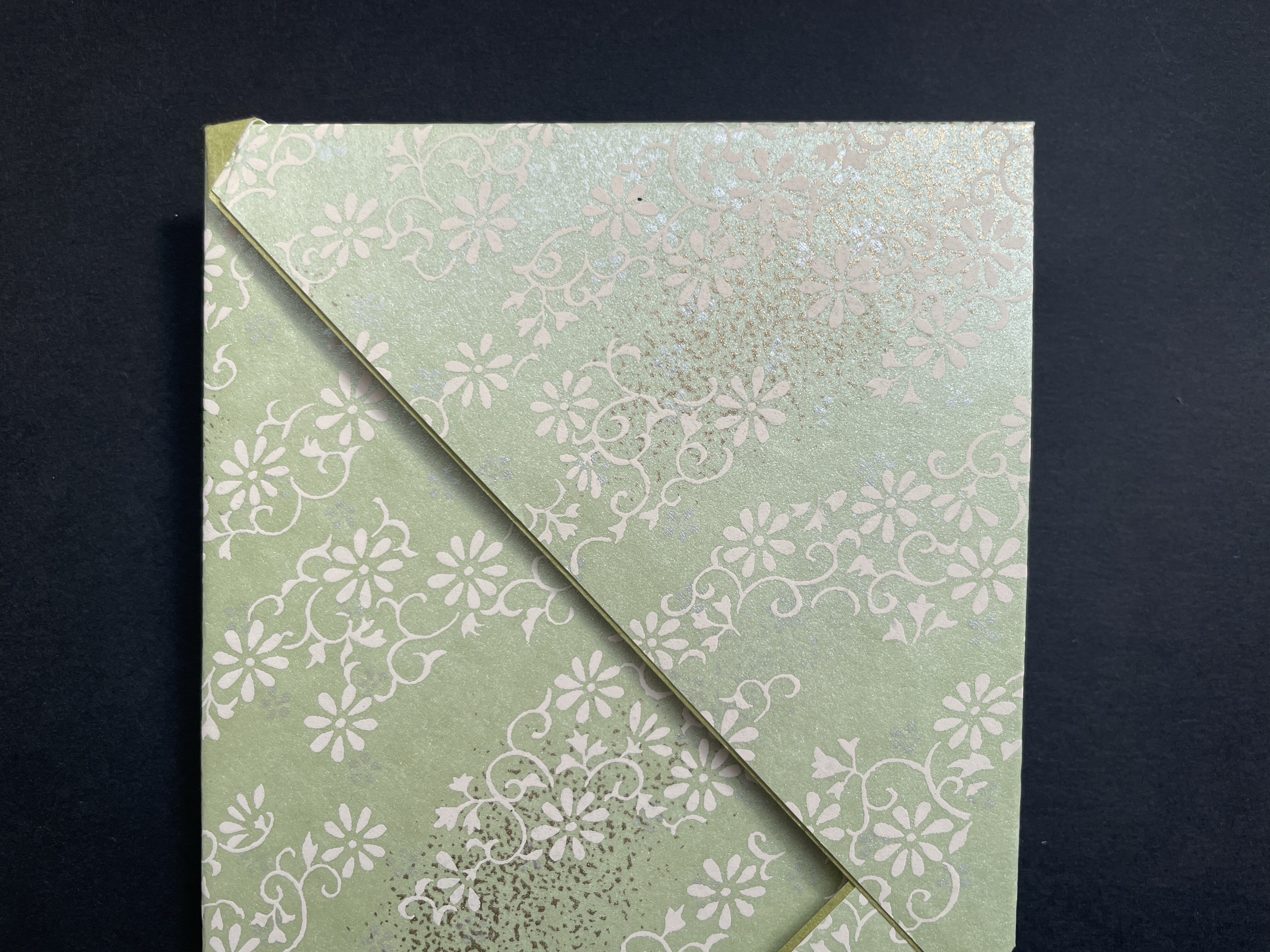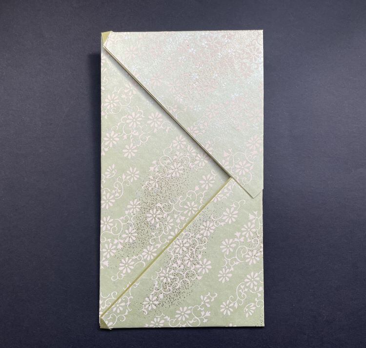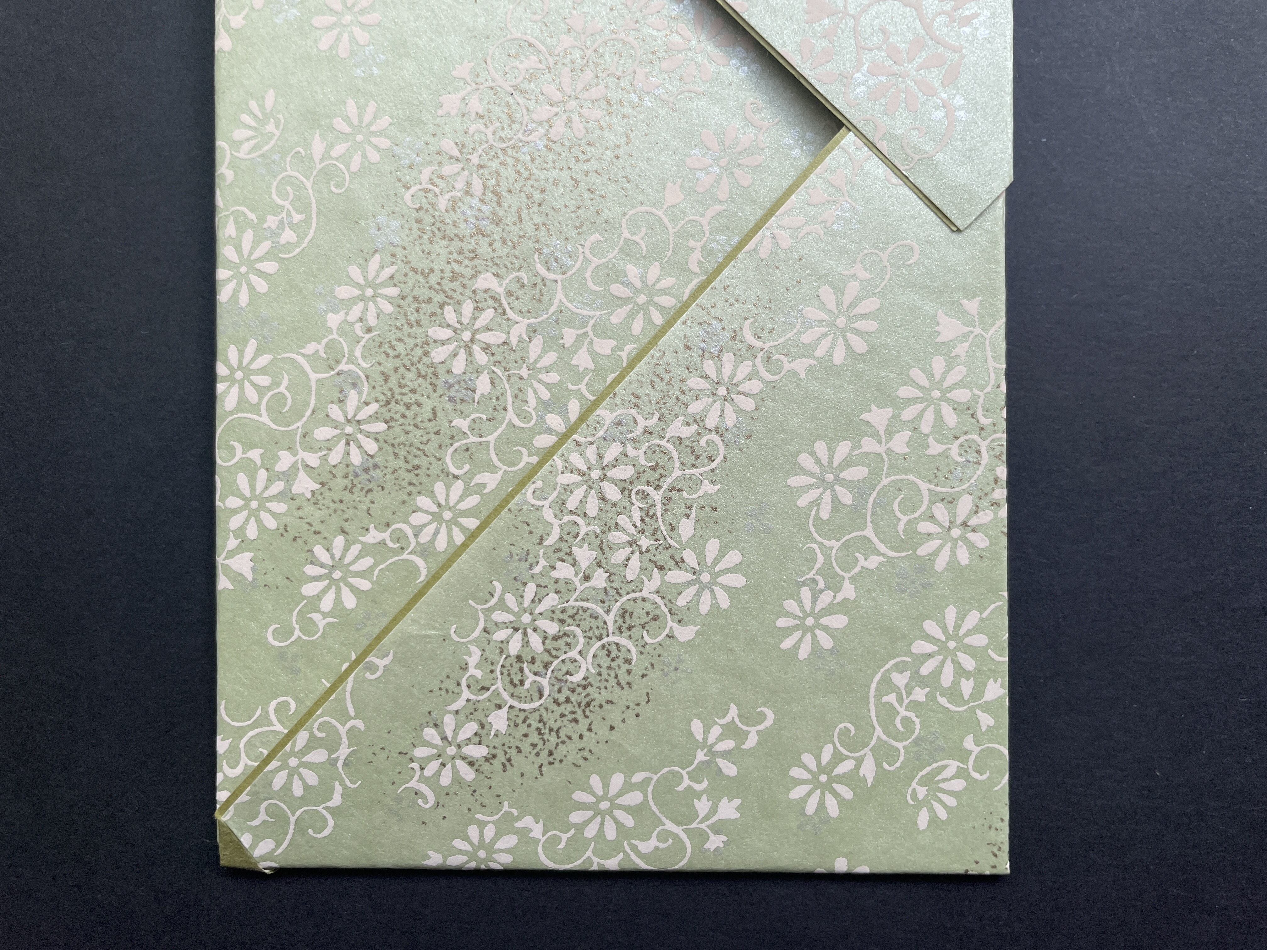 【しのぶふみ】花唐草 小なり サイズ 20㎝×11㎝ 厚み2㎜ 花唐草柄には、「繁栄」「長寿」の意味があり、縁起が良いとされています。地色にパールを使った美しい手染め友禅和紙を使い、日本伝統の折形技法を用いて、ひとつずつ手づくりしています。中に直筆用の和紙(どの色か1枚)が入っております。