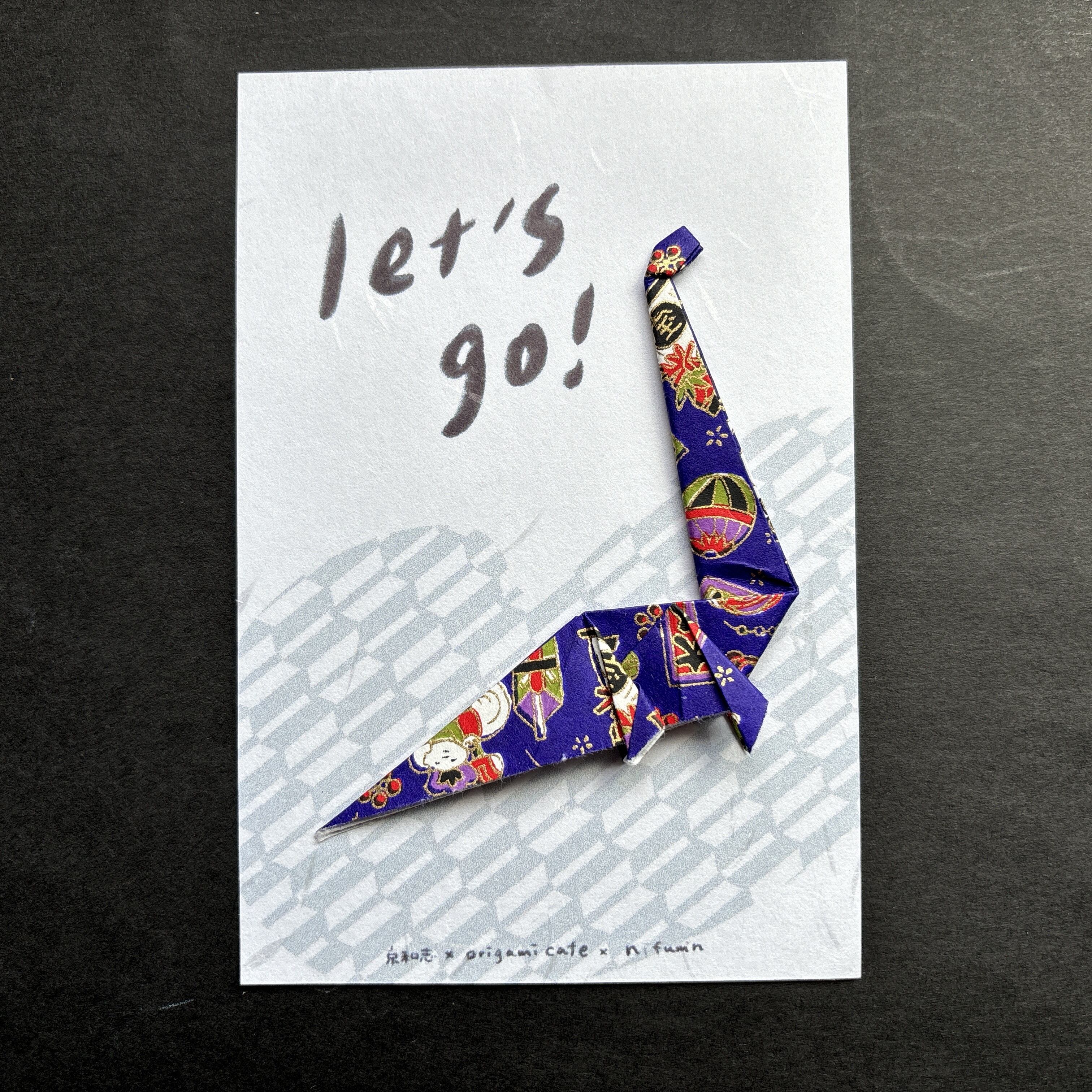 【友禅和紙ORIGAMIカード】 恐竜 緑系 恐竜モチーフが上向きに伸びる元気なデザインは、子どもたちの想像力を膨らませる特別なアイテムとしてや、恐竜好きな方への贈り物にぴったりです。海外のかたにも人気のあるデザインです。おめでたい柄の入った青系の美しい友禅和紙を使用し、折り紙講師が一つ一つ心を込めて仕上げています。和紙製の封筒が付属しており、そのまま贈り物としてや郵送(要切手)にも便利です。さらに、この商品は赤い羽根募金百貨店登録商品であり、購入を通じて社会貢献にも寄与することができます。10cm ×14.8㎝(ハガキサイズ)×厚み2㎜ 郵便番号欄なし