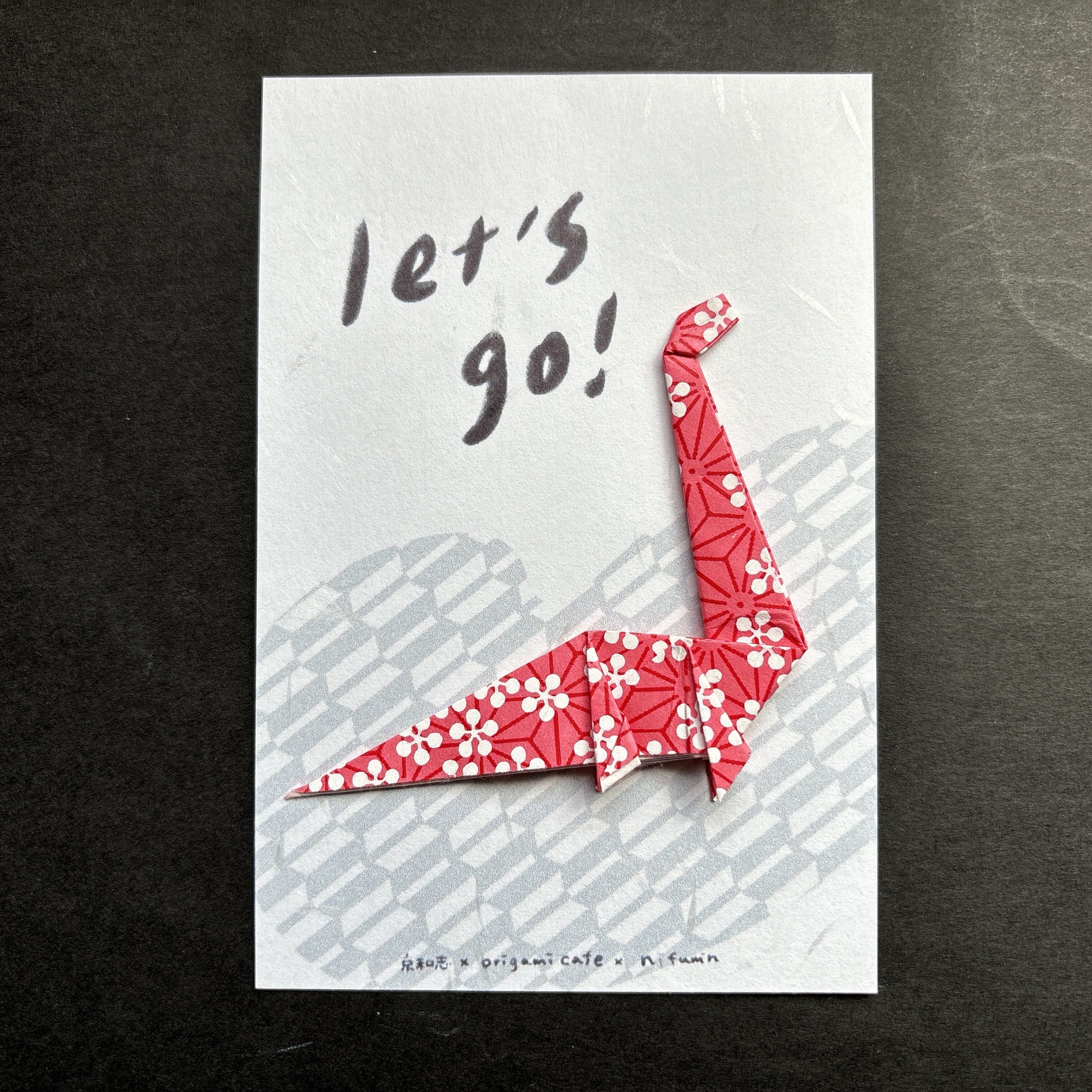 友禅和紙ORIGAMIカード】 恐竜 ピンク系 恐竜モチーフが上向きに伸びる元気なデザインは、子どもたちの想像力を膨らませる特別なアイテムとしてや、恐竜好きな方への贈り物にぴったりです。海外のかたにも人気のあるデザインです。麻と梅鉢の紋柄でピンク系の美しい友禅和紙を使用し、折り紙講師が一つ一つ心を込めて仕上げています。和紙製の封筒が付属しており、そのまま贈り物としてや郵送(要切手)にも便利です。さらに、この商品は赤い羽根募金百貨店登録商品であり、購入を通じて社会貢献にも寄与することができます。10cm ×14.8㎝(ハガキサイズ)×厚み2㎜ 郵便番号欄なし